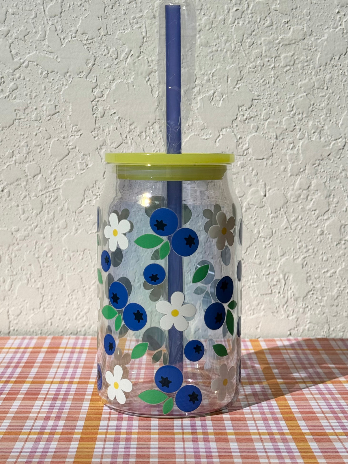 Don't worry, be berry! Perfect for coffee, juices, or any other drink this 16 oz glass tumbler comes with a lime green plastic lid and a straw. Perfect for use in the home or on the go! This print is double-sided and visible from the inside and the outside of the tumbler!